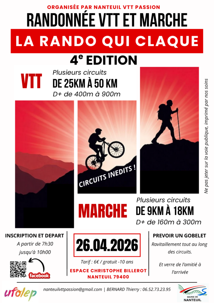 + d’infos : plusieurs circuits de 9 KM à 18 KM D+ de 160m à 300m – tarif : 6€ / gratuit – 10 ans / inscription et départ à partir de 7h30 jusqu’à 10h à l’espace Christophe Billerot – salle des fêtes communale / prévoir un gobelet, ravitaillement tout au long des circuits et verre de l’amitié à l’arrivée / contact : nanteuilvttpassion@gmail.com / Thierry Bernard : 06 52 73 23 95 – page Facebook : https://www.facebook.com/Nanteuilvttpassion